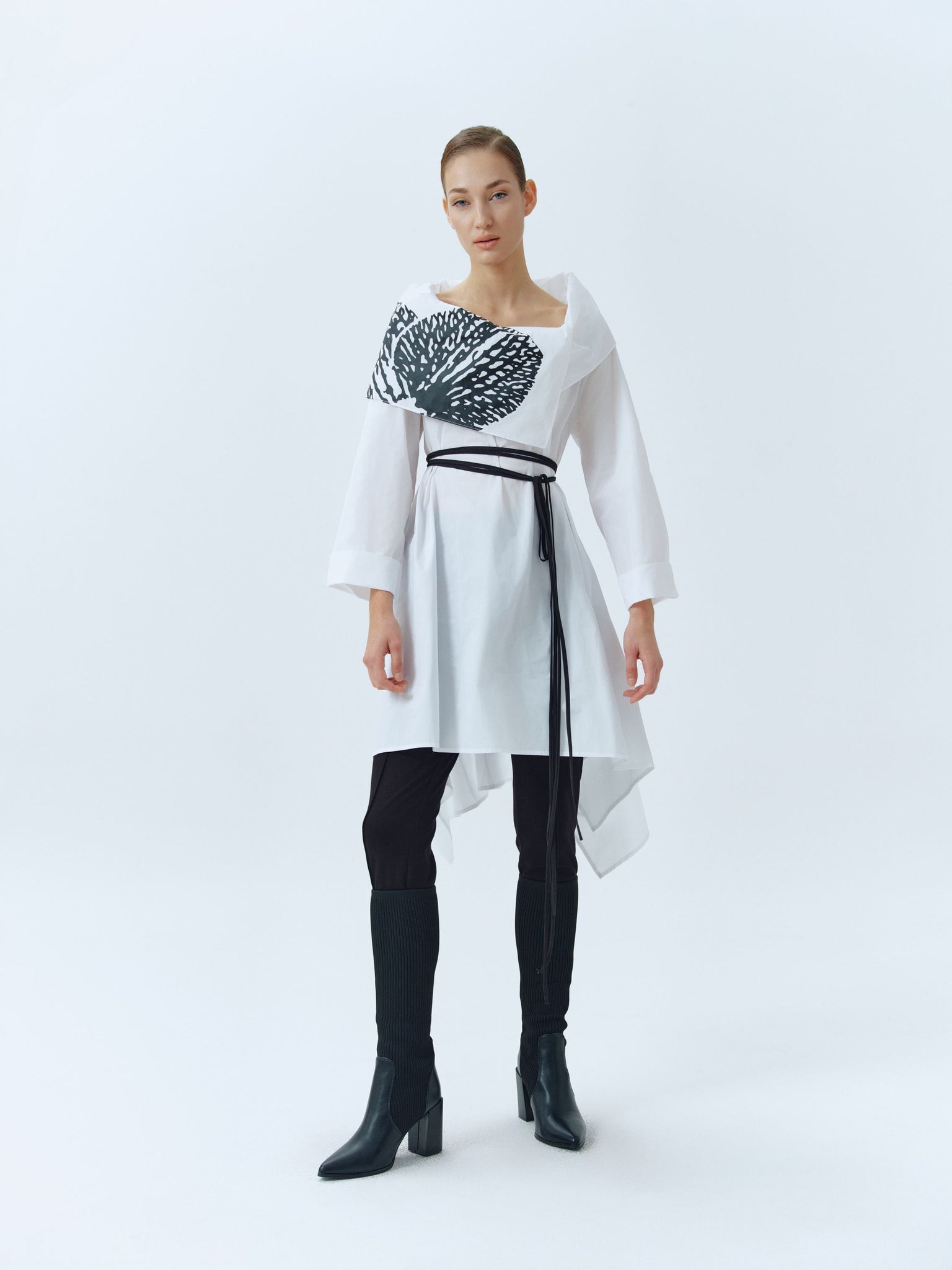 White asymmetric taffeta blouse with large overlapping collar with printed floral pattern, side sllits, cuffed sleeves and waist-wrapping black ribbon. Available also in black.
