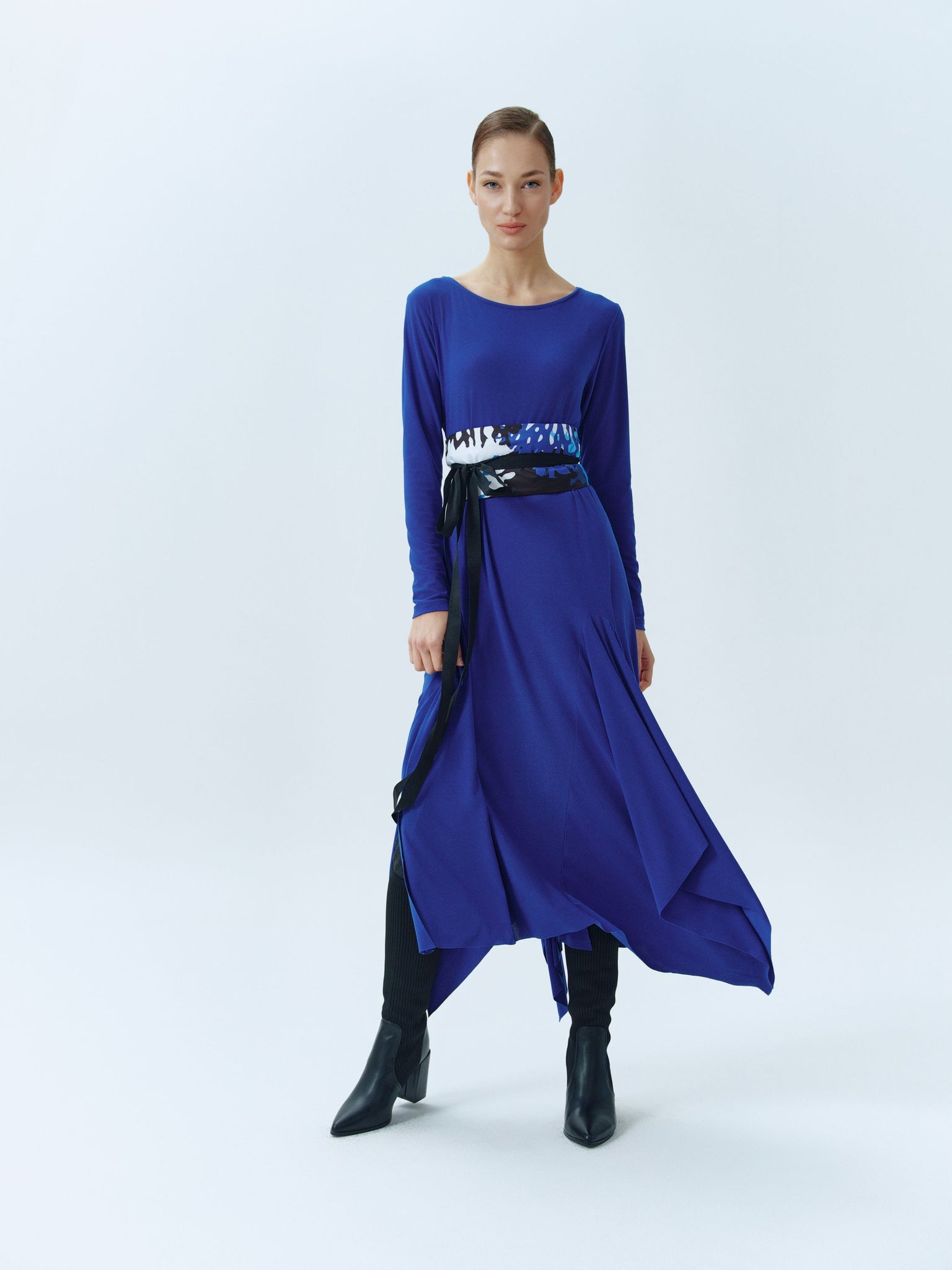 Royal blue, playful dress with an asymmetrical look with a round neckline, long fitted sleeves and side slits. Available also in black and burgundy.