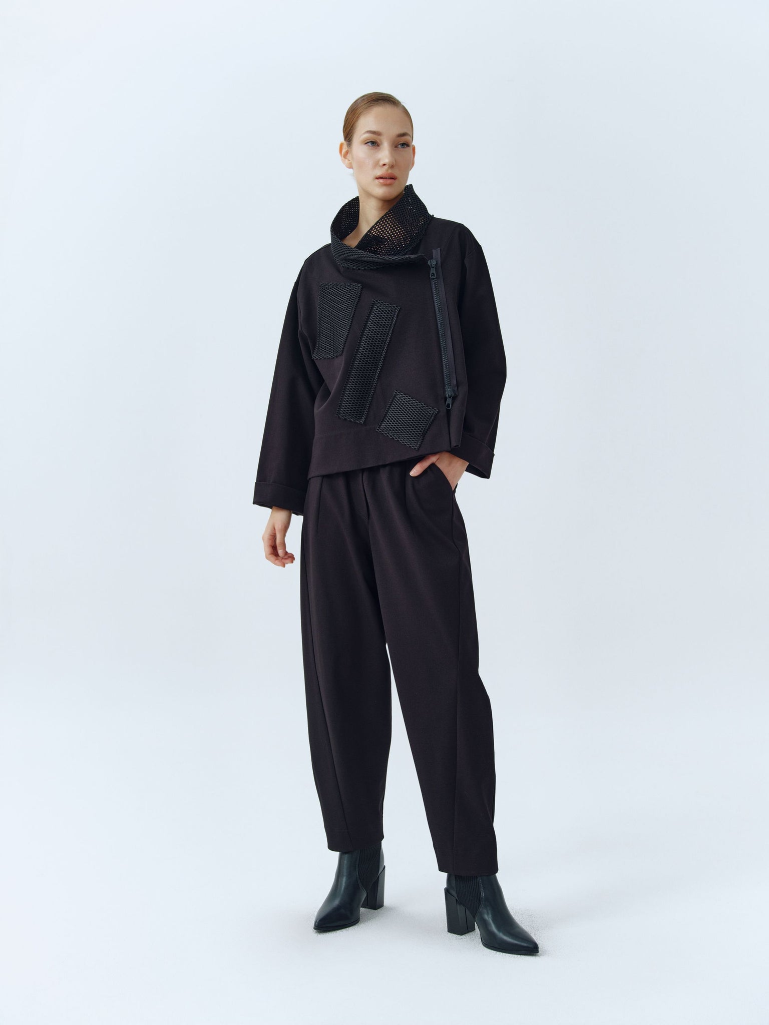 Black short square-cut jersey jacket with mesh details, long cuff sleeves and wide stand collar. Right front is overlaping left featuring zipper fastening. Timeless design  make this jacket the ultimative choice for fashionable stylings.