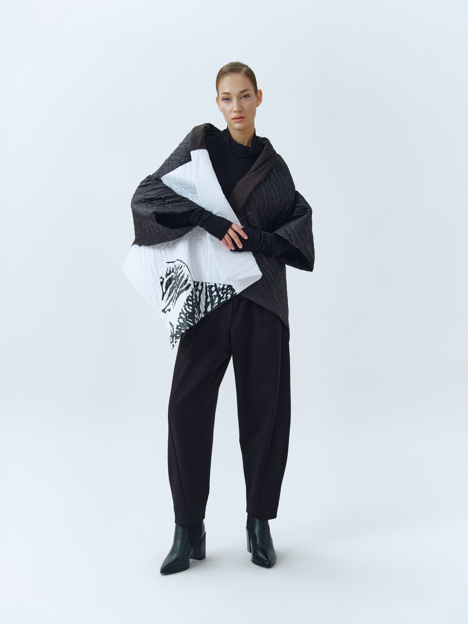 Black jersay peg-legged pants, featuring pleated fronts, side pockets and elasticated waistband. Available also in dark grey.