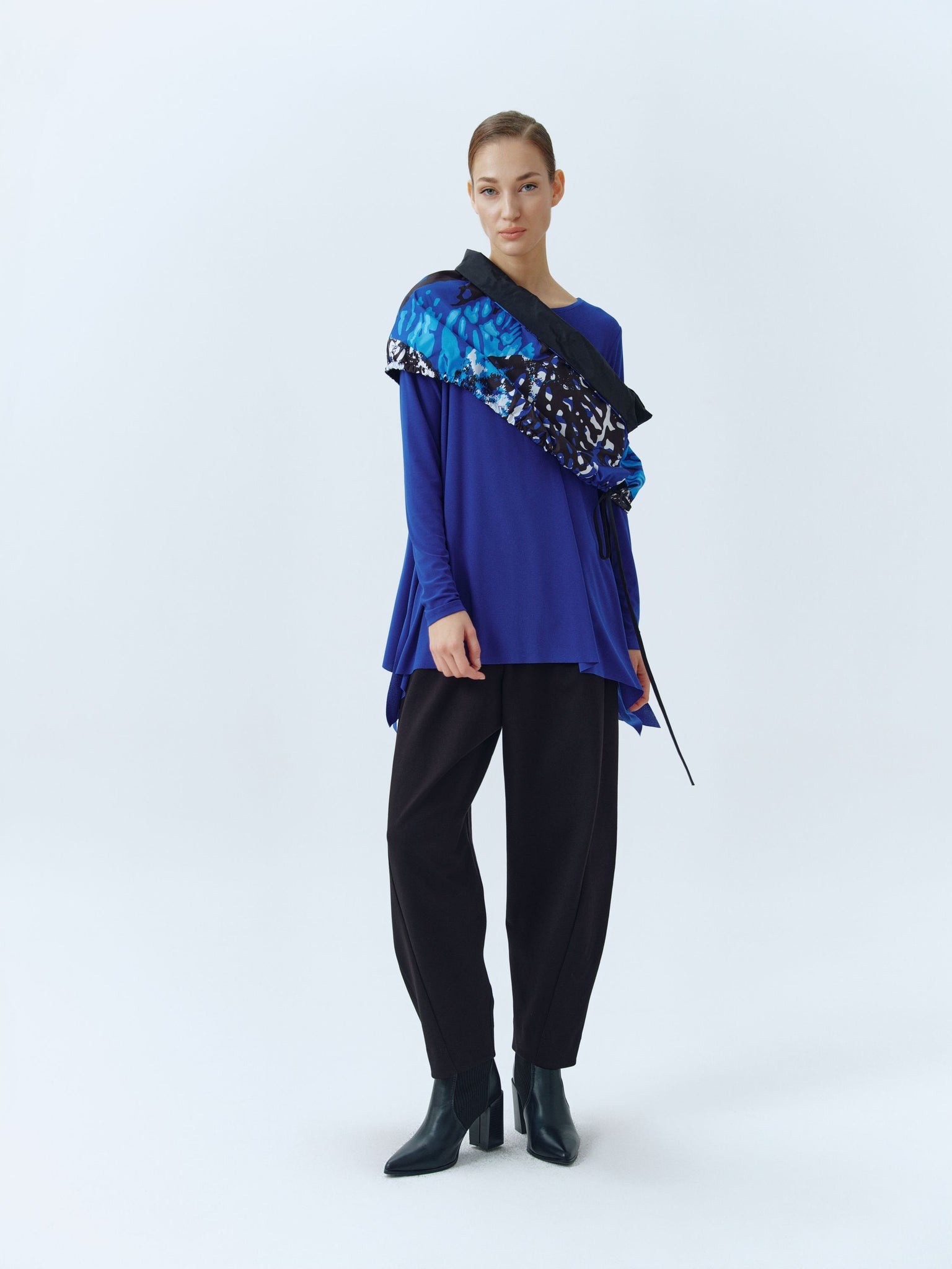 V-shaped scarf with side slit and fixing with ribbons. Eyecatching accessorie that can lift up any combination.