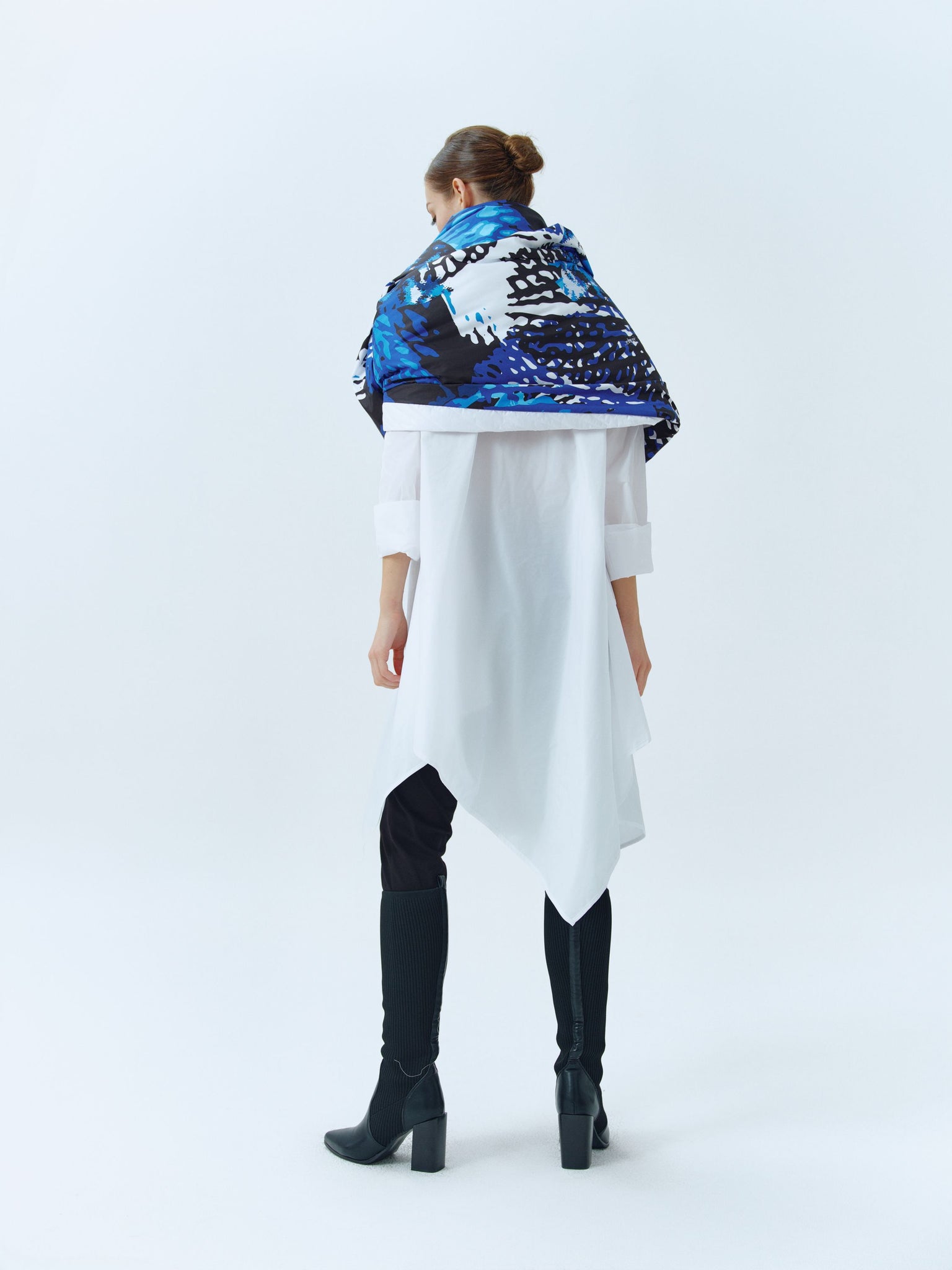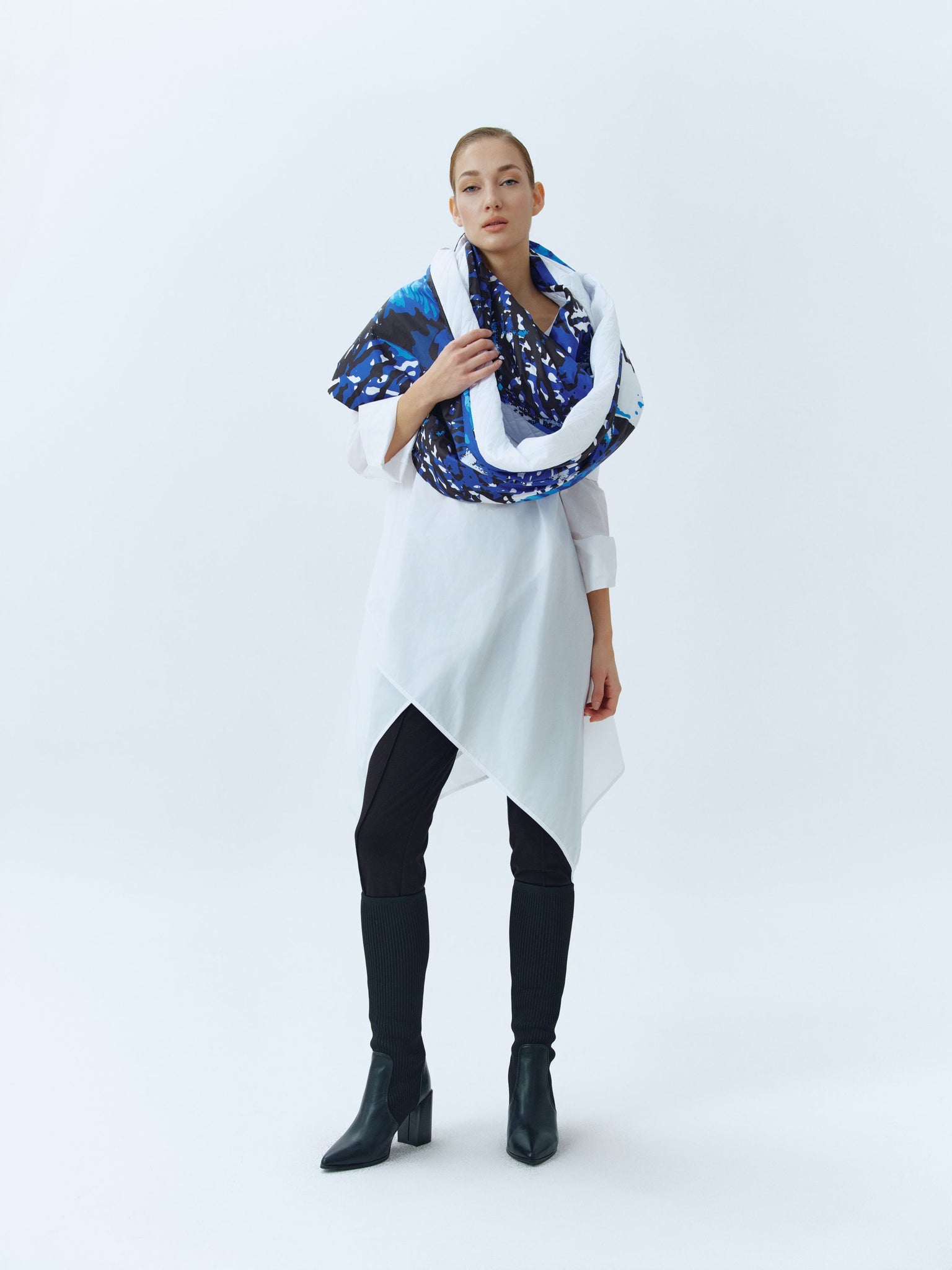 Infinity puffer scarf in combination of white and print worn on both side.