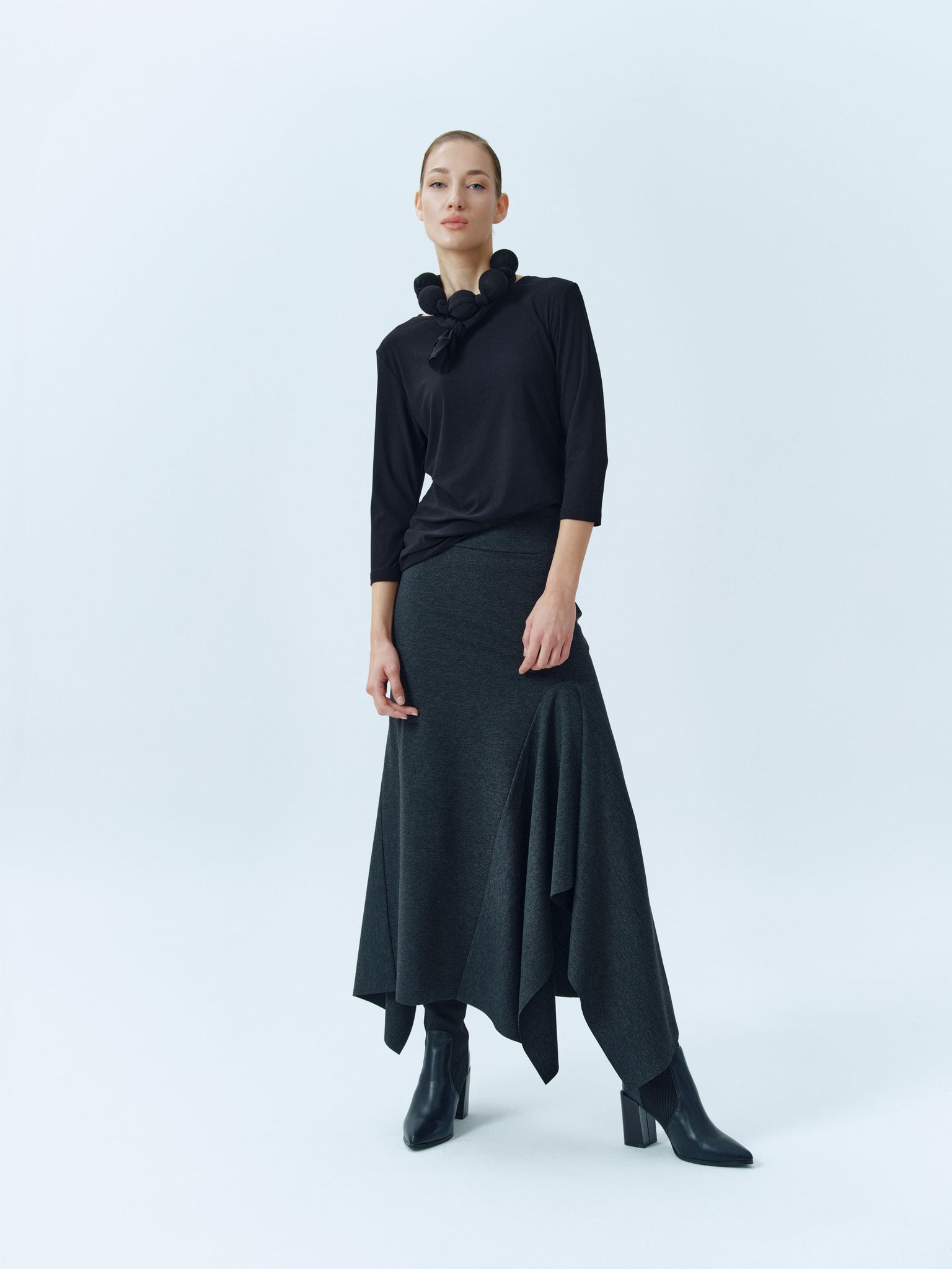 Long high waisted asimmetrycal jersey skirt. Available in grey and black.