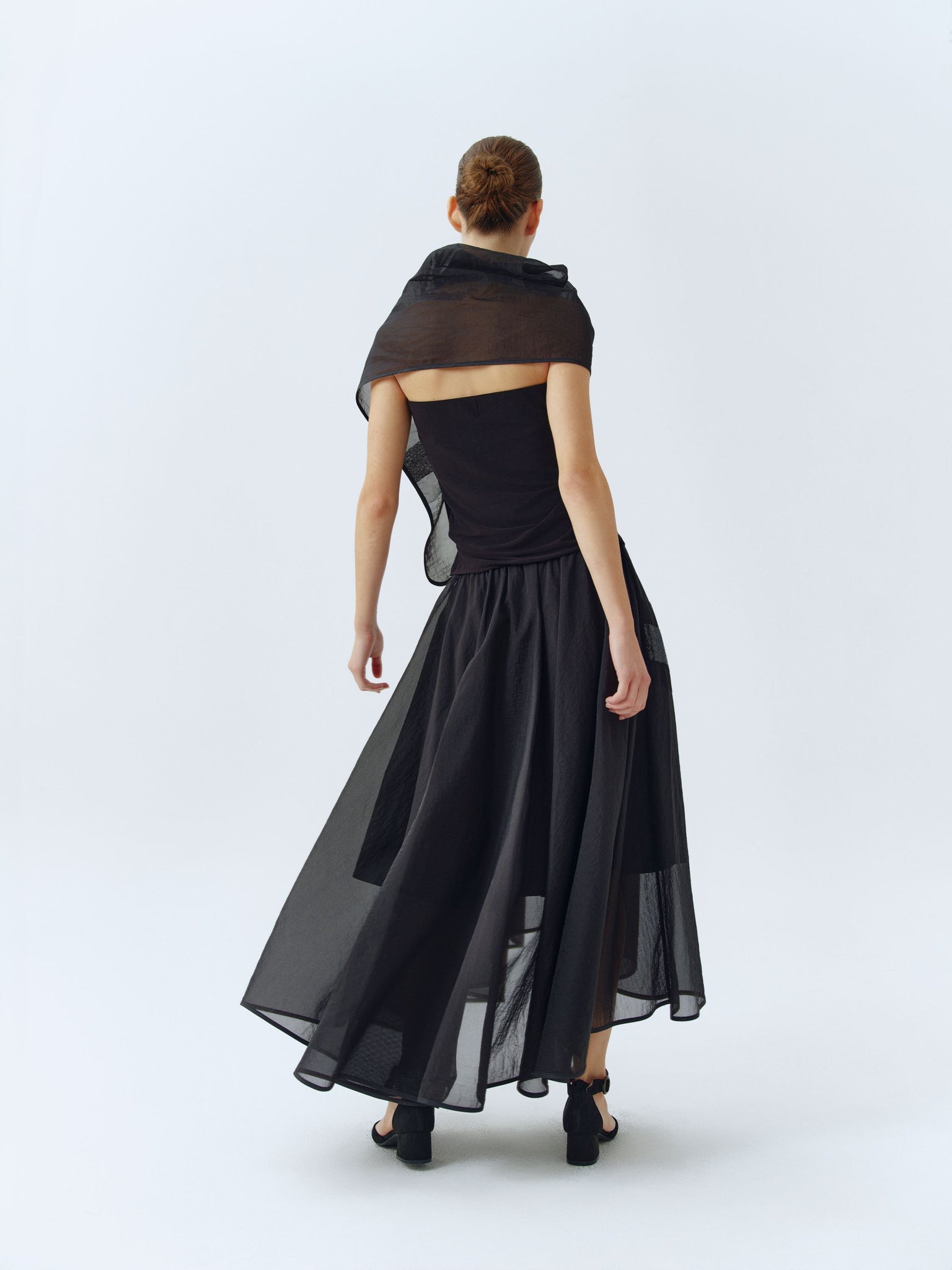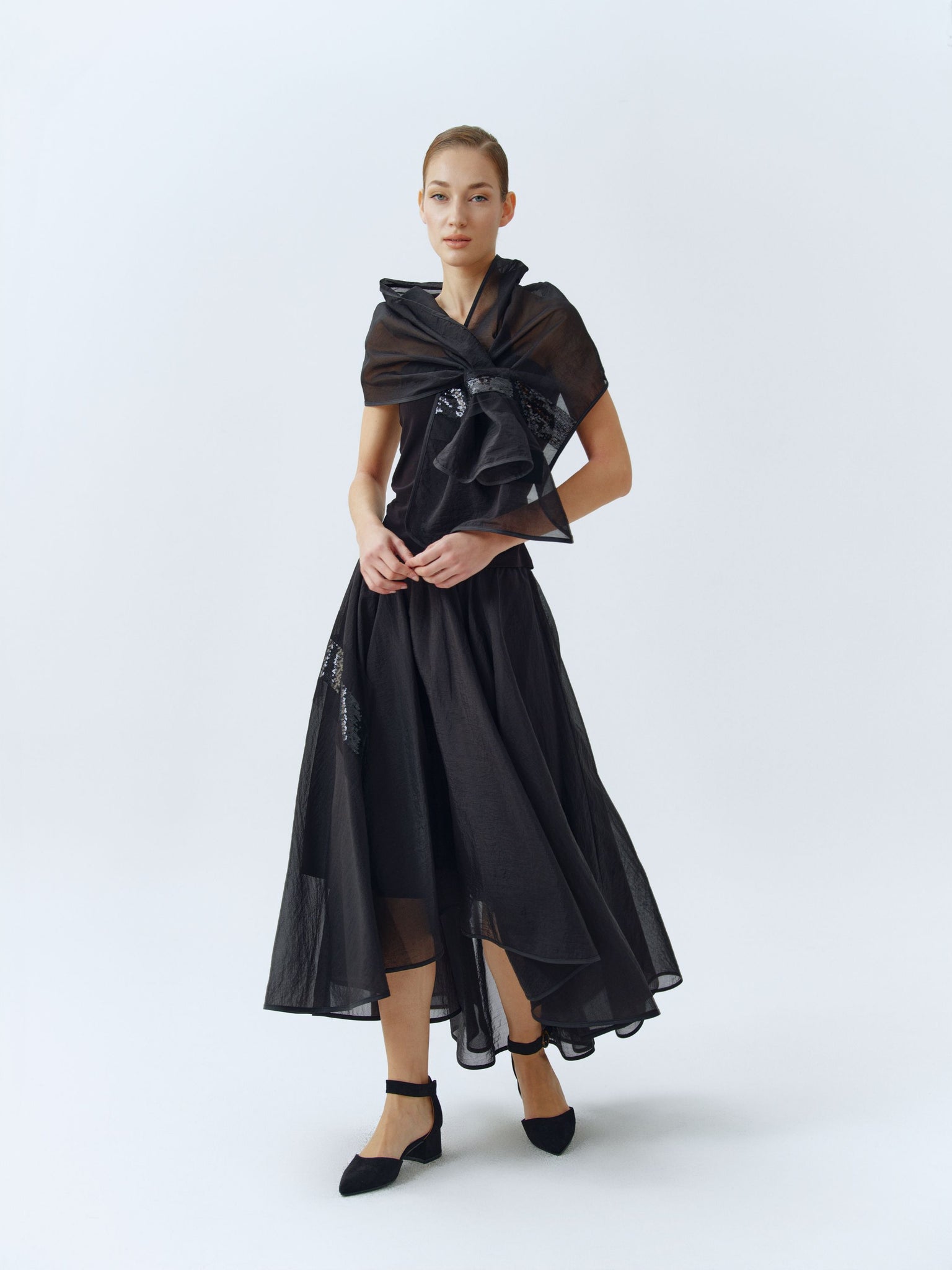 Airy,black organdy skirt decorated with sequined detail, comfortable to wear thanks to the wide cut and elastic waistband. Edgy and stylish garment that ensure turning heads in every occasion.