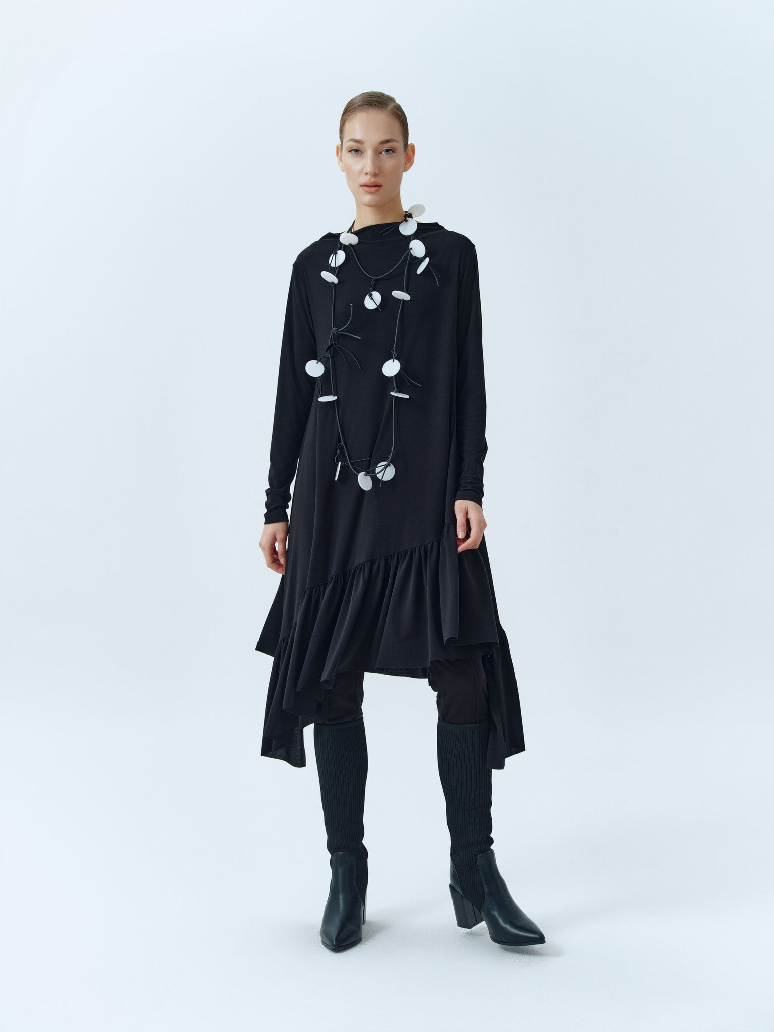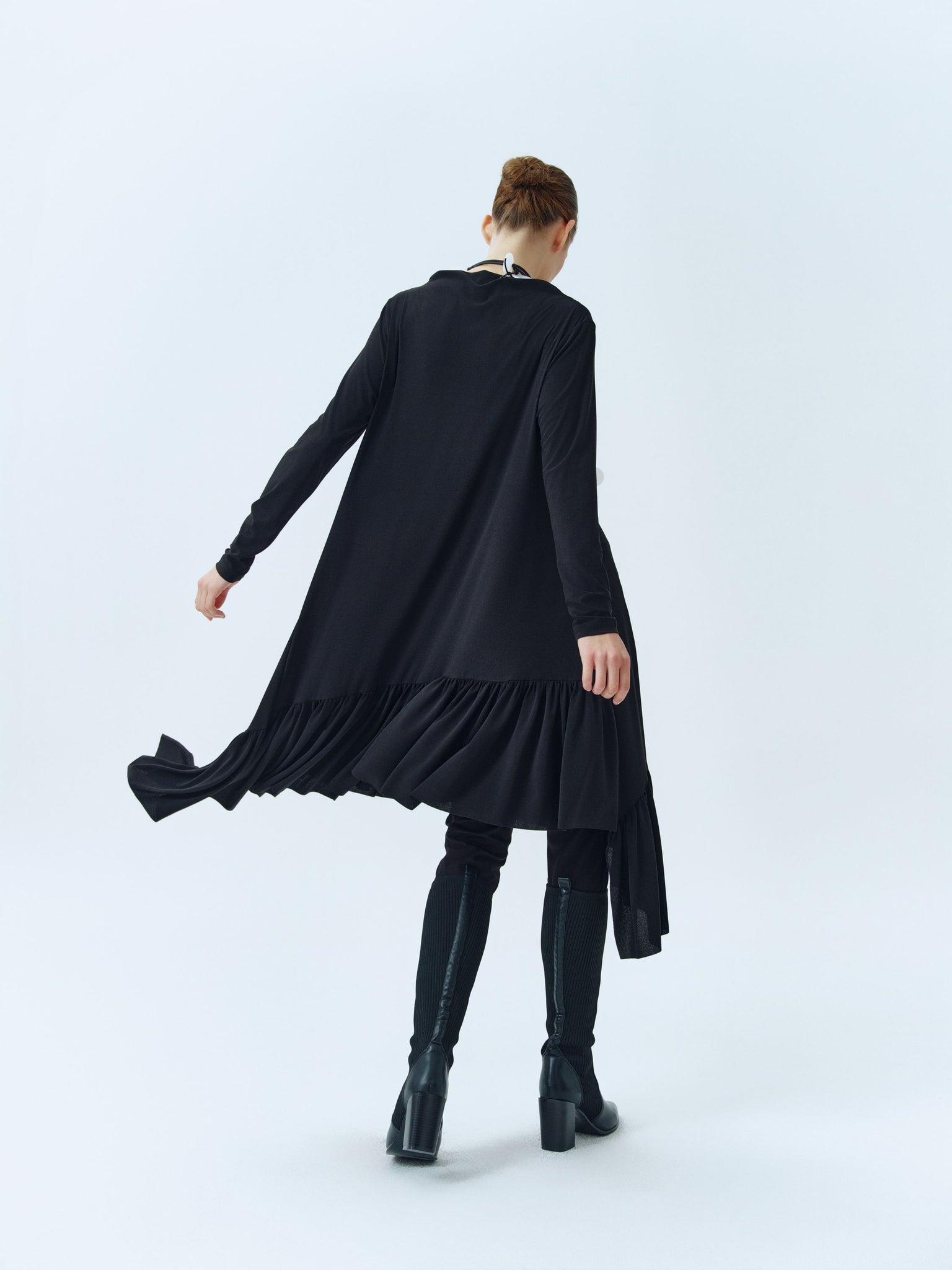 A-shaped, wide jersey tunic with long sleeves and boat neckline. Available in black, royal blue and burgundy.