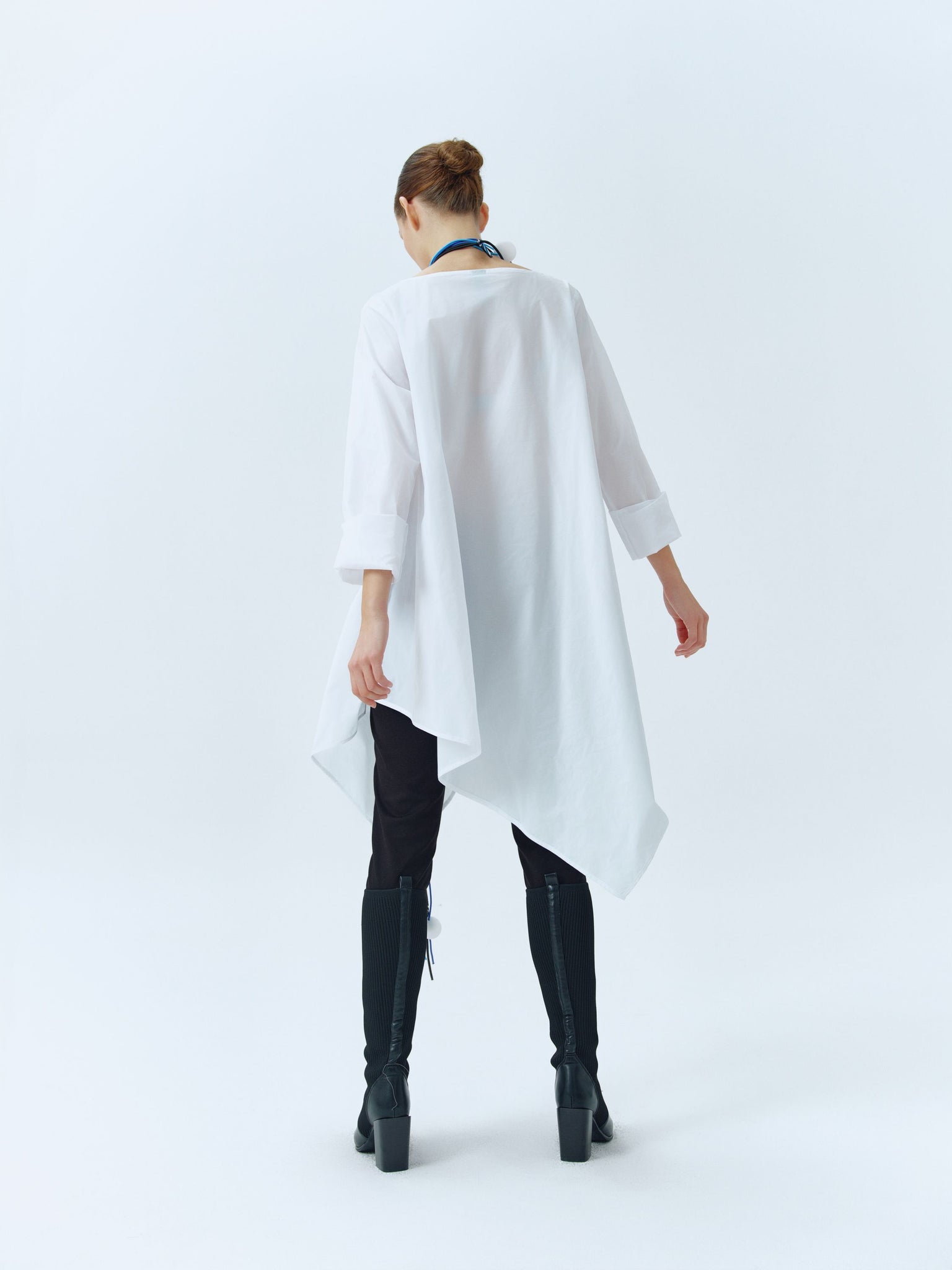 White asymmetric A-cut taffeta tunic with long cuff sleeves and round neckline. Available also in black.