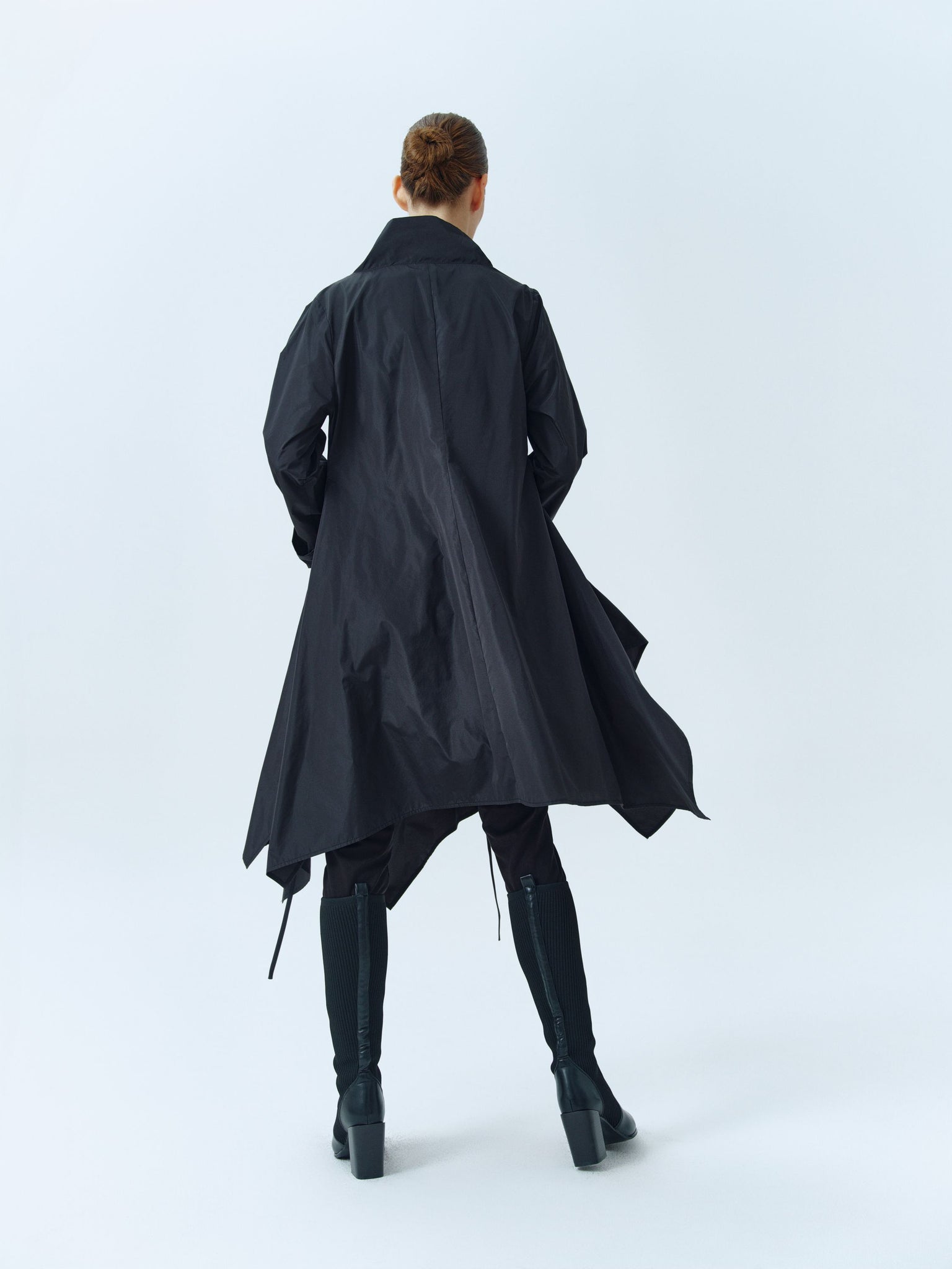 Asymmetric taffeta tunic with large stand collar with ribbons and cuff sleeves. Available in black and white.