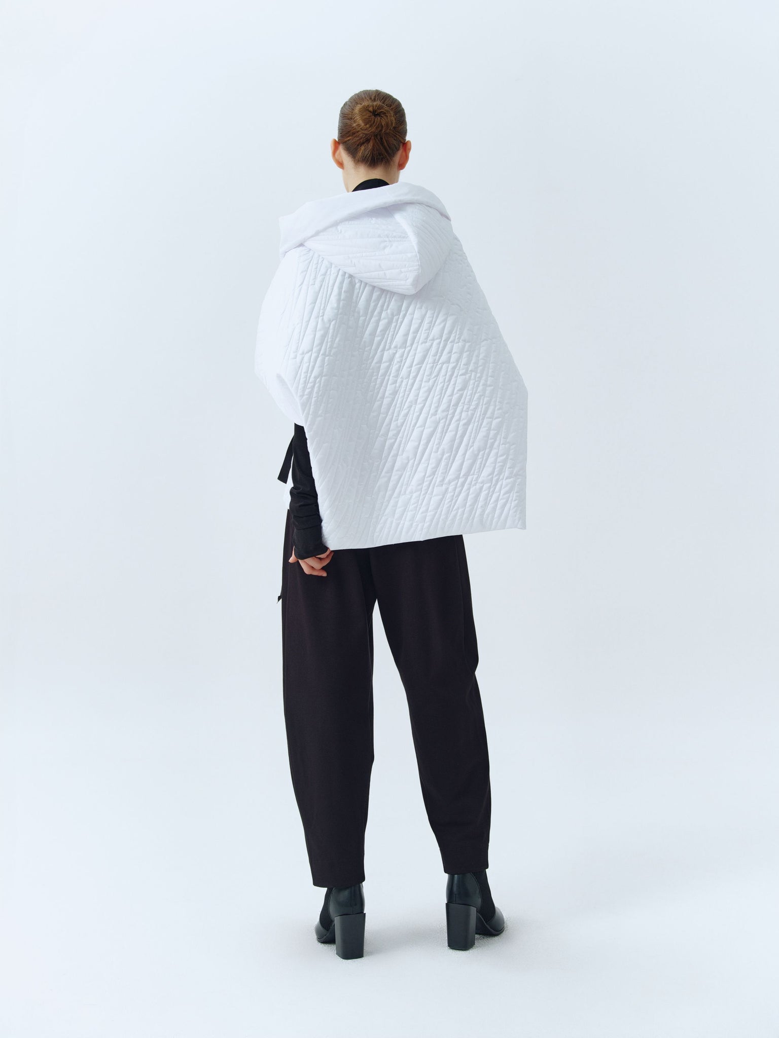 Short square-cut puffer dropped shoulder waist coat. Hooded, relaxed fitted featuring front zip fastening and waist-wrapping black ribbon. Available in white and black.
