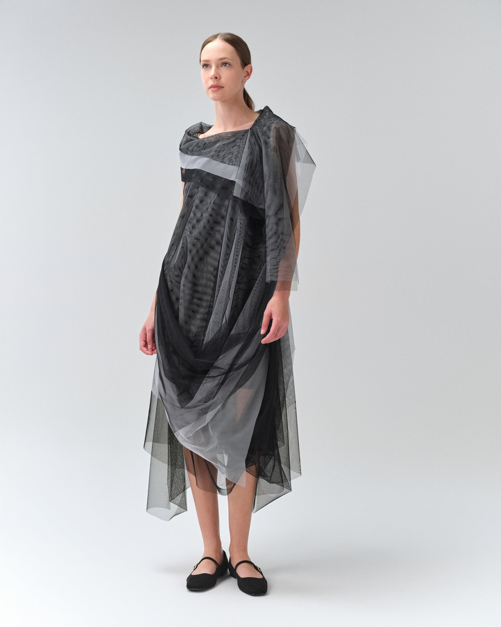 Playful dress crafted in a combination of gray and black tulle over a tube dress made of jersey.